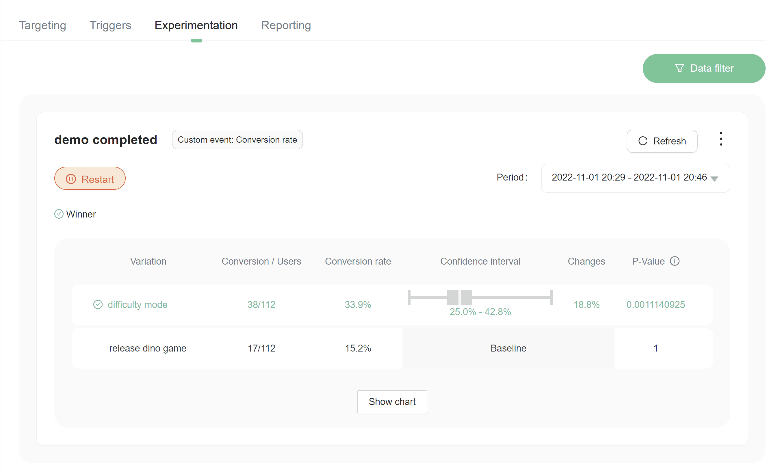 The winning variation for a completed experiment is the variation that is most likely to be the best option out of all of the variations tested. FeatBit indicates clearly which variation is likely to be the best option with an icon of green correct in a circle .png)