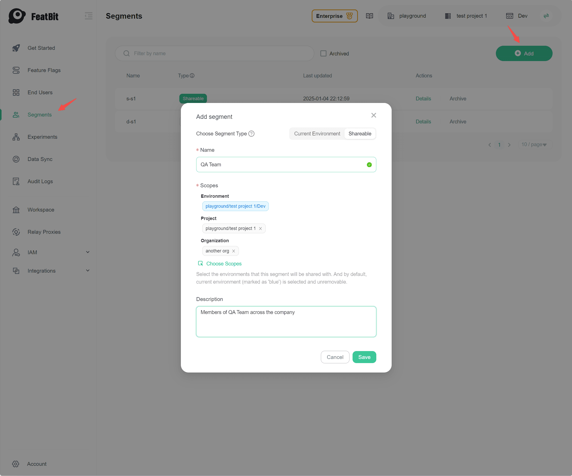 Shareable Segments allow you to define a group of users that can be reused across different environments, projects, or organizations. This simplifies management and ensures consistency when targeting the same user groups in various contexts.