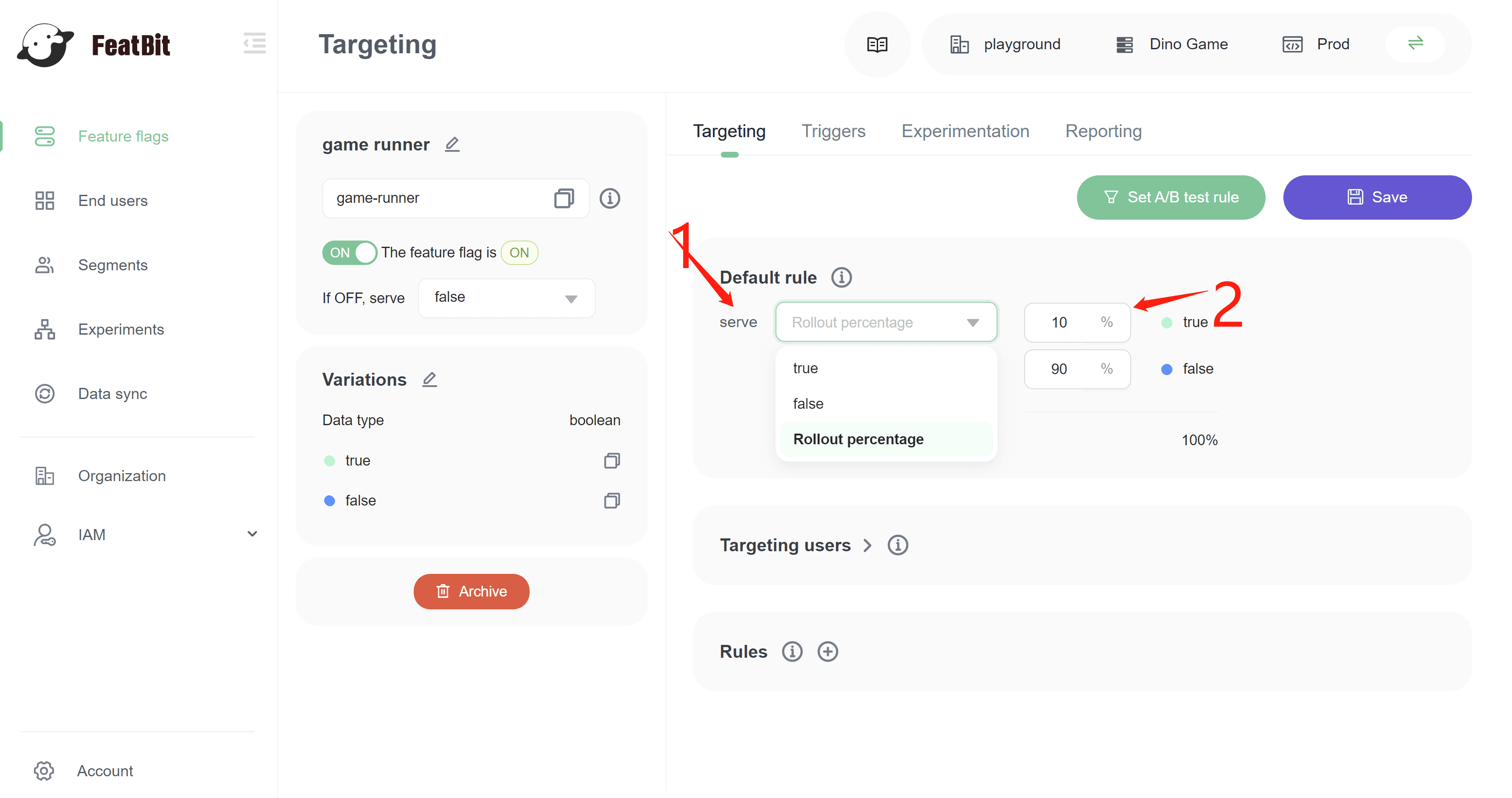 Go back to "game runner" feature flag's "Targeting" page. Create a rule with the property "orgId" you just created. You need to: